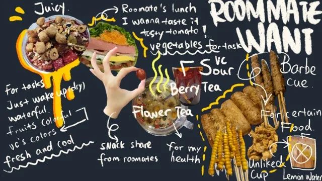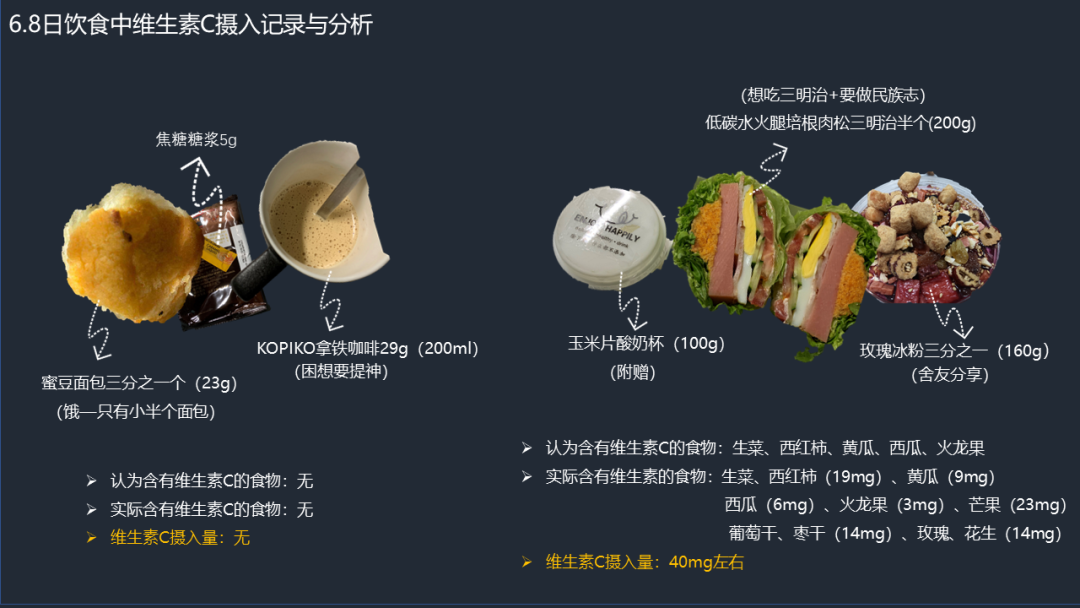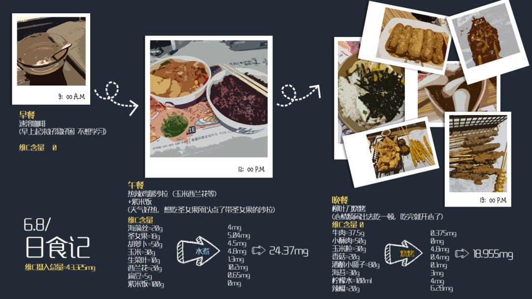 实验设计出发点是为了记录日常生活中的维生素C摄入量,探讨饮食决策的影响因素。小组成员在三天中通过拍照的方法记录自己的饮食情况,参考营养元素含量表计算摄入维C值,制作拼贴画进行汇总展示。实验发现,小组成员对于食物中维C含量难以进行正确估计,且维C摄入极为不足、群体性在小组成员饮食决定中具有重要影响、通过新鲜蔬果摄入维生素C是目前的最佳方法。
