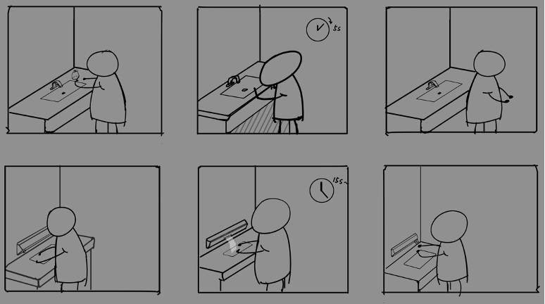 我们在清洁场所搭建了模拟产品最终使用的环境,并随机邀请被测对象,最终共8人参与到我们的实验。每位被试分别体验了三种不同的洗手方式:视频引导洗手、设计原型引导洗手、无引导洗手。我们比较了洗手时间和清洁效果,并让被试对体验感和产品必要性进行了评价。