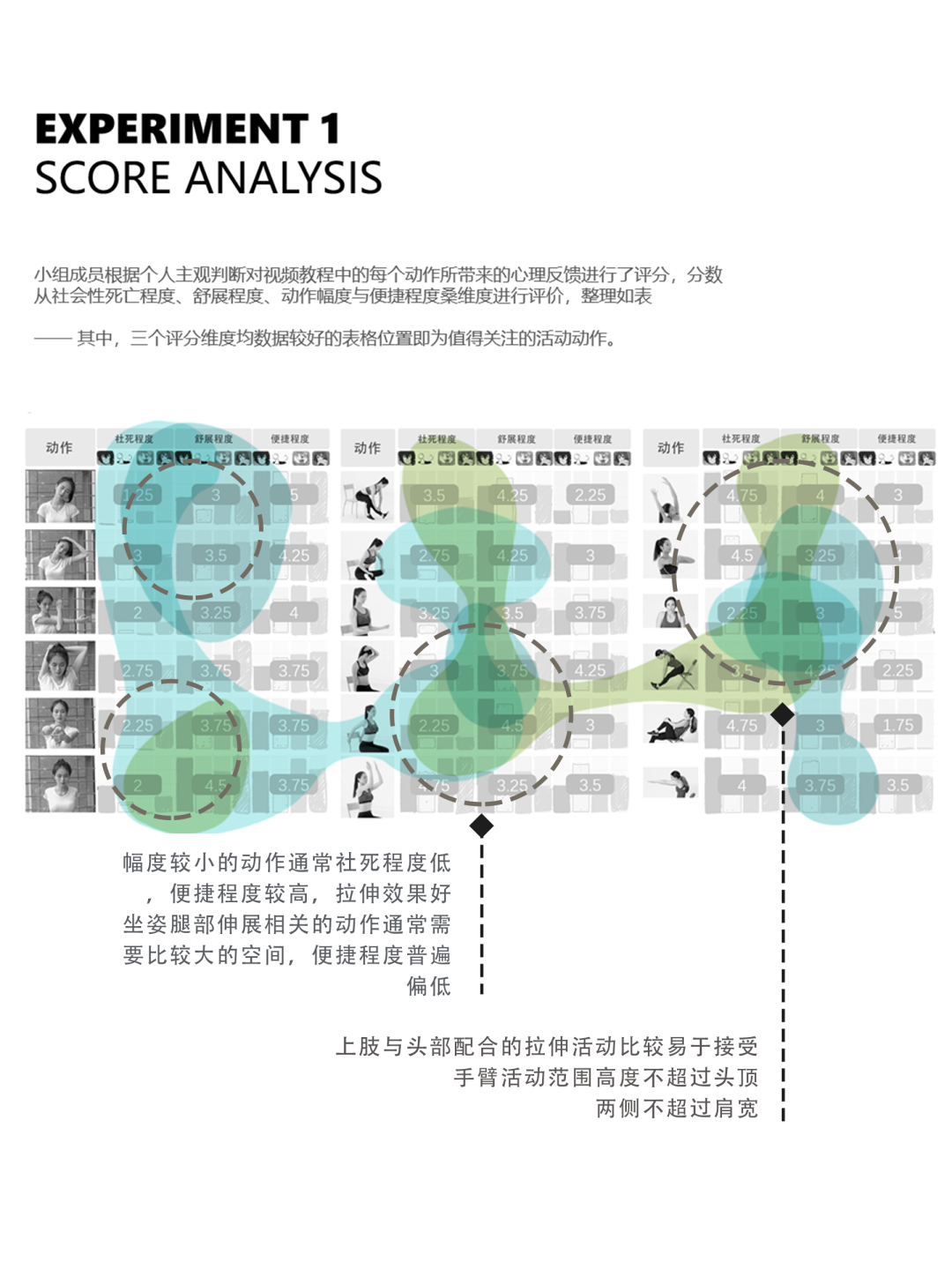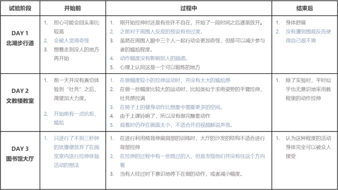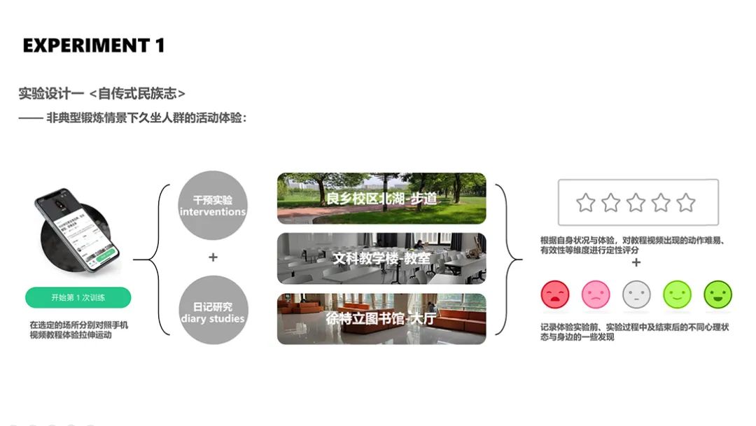 实验设计的出发点是探究在非典型运动场所中运动会存在一定的心理压力。基于此,我们设计了如下实验——分三天分别在三个代表性场景中(北湖步道、教室、图书馆)对照手机教程完成一套拉伸运动并用表格记录心理和生理状态,最后结合个人体验对不同动作进行评分。