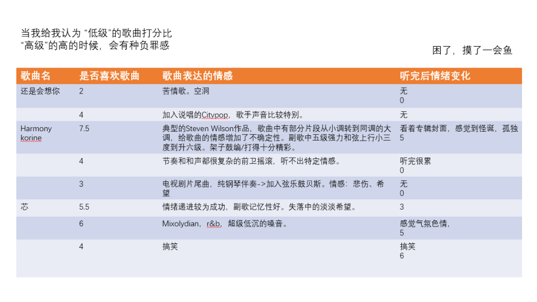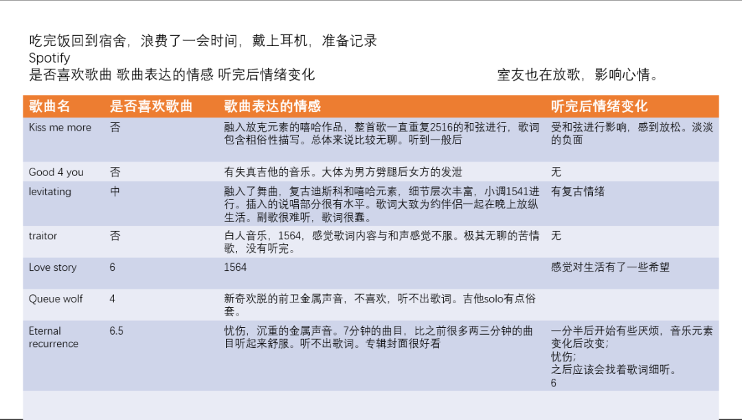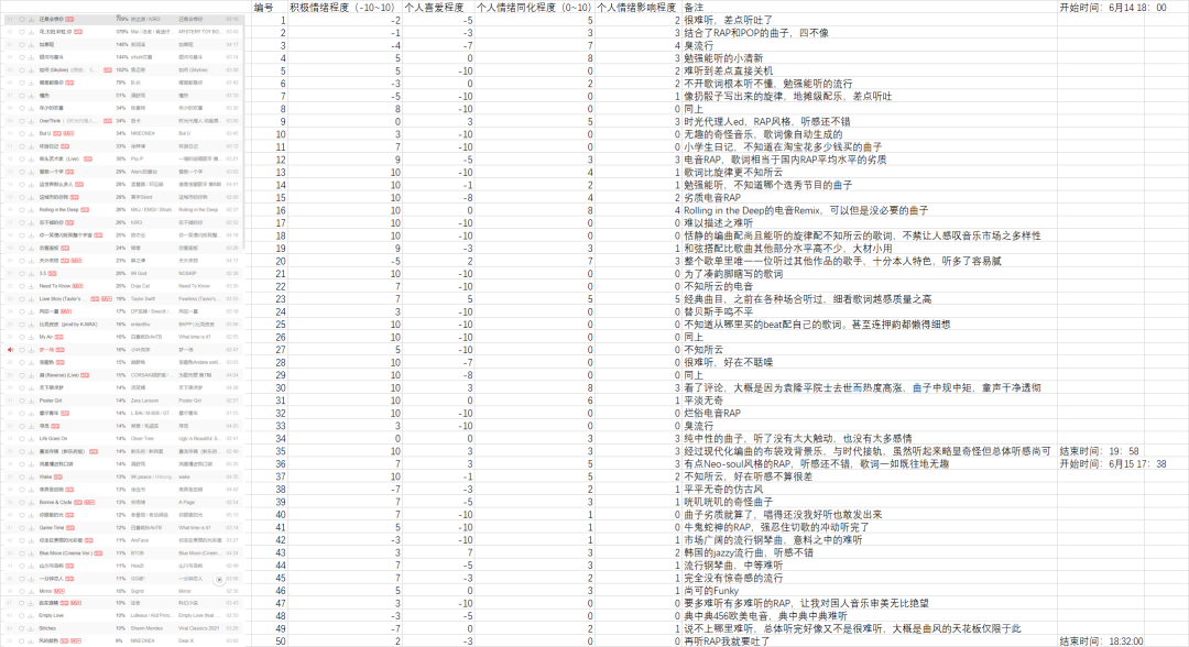 实验设计的出发点是探究歌曲对人情绪的影响。基于此,我们设计了如下实验——记录每首歌曲播放时间、播放方式、地点情景与听歌后的情绪变化,按照情绪积极程度,个人喜爱程度,情绪同化和情绪影响四个维度进行量化打分。