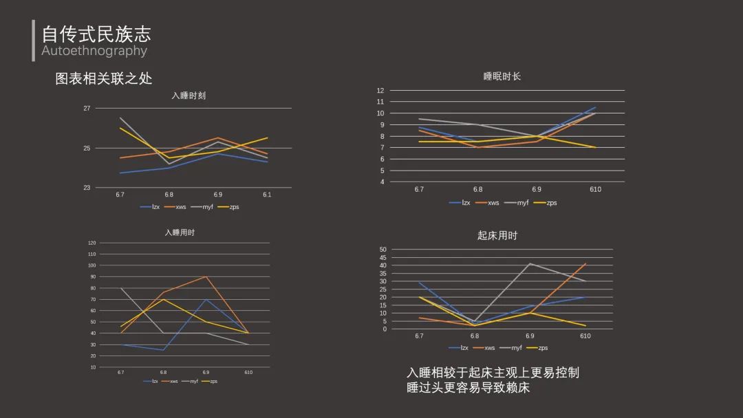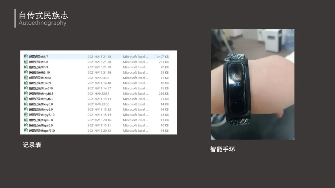 实验设计的出发点是为了探索不同的元素(如睡眠时间、睡前活动、唤醒方式等)对睡眠的影响,从而找到提升睡眠质量或睡眠体验的方式。小组四人每天控制改变一个变量(睡眠时间、助眠方式、唤醒方式),填写睡眠数据表记录主观感受,并使用智能手环记录客观数据。