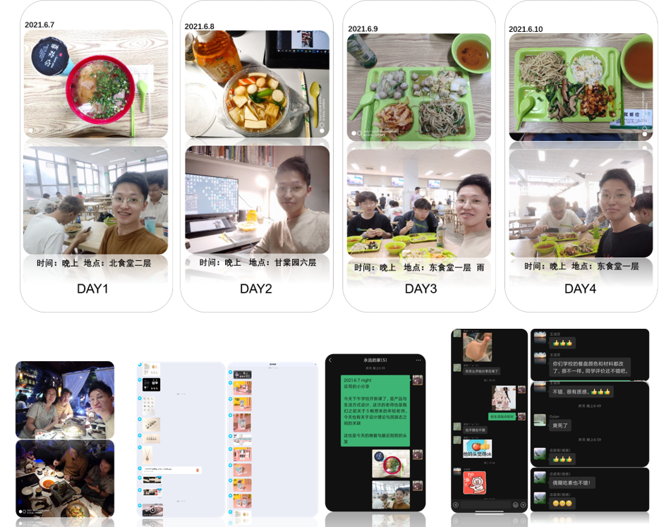为了探究共享桌板的有效性,我们邀请到了同一宿舍有共同进食习惯的两位同学,进行了为期三天的用户测试。实验中被试会及时向实验员汇报饮食情况,实验员指导被试与产品原型进行互动。实验结束后对其中一位被试者进行了约40分钟的半开放式用户访谈。