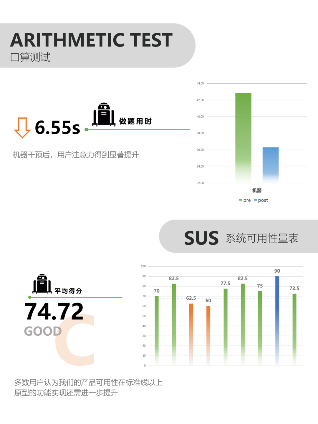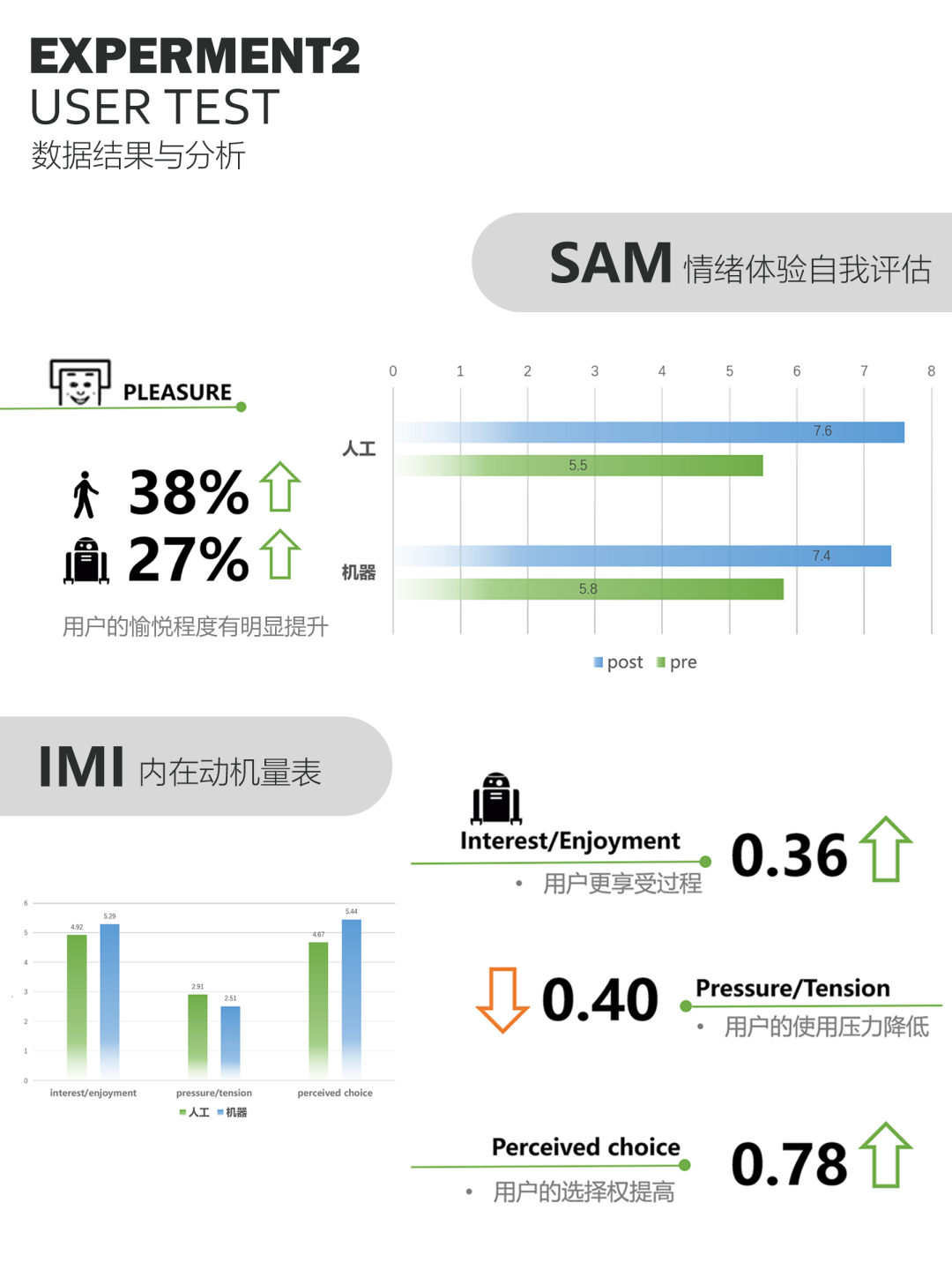 我们发现不同干预后,被试的心情都更加愉悦,人为干预相对机器人干预效果更明显。机器人干预能带给用户更享受的体验、更低的使用压力、更高的选择权。未来设计需进一步考虑用户在专心时的注意力水平,以及机器人与用户的交互方式、引导方式、功能拓展等方面。