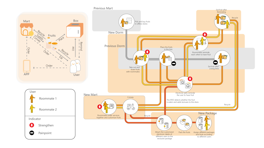 我们设计了基于共享桌板的服务系统。用户通过手机订购每日需要的维生素C,降低操作成本,利用食品包装记录信息,简单直接地记录饮食情况和营养摄入,通过隐喻化的形式和竞争机制增加维生素C的摄入。
