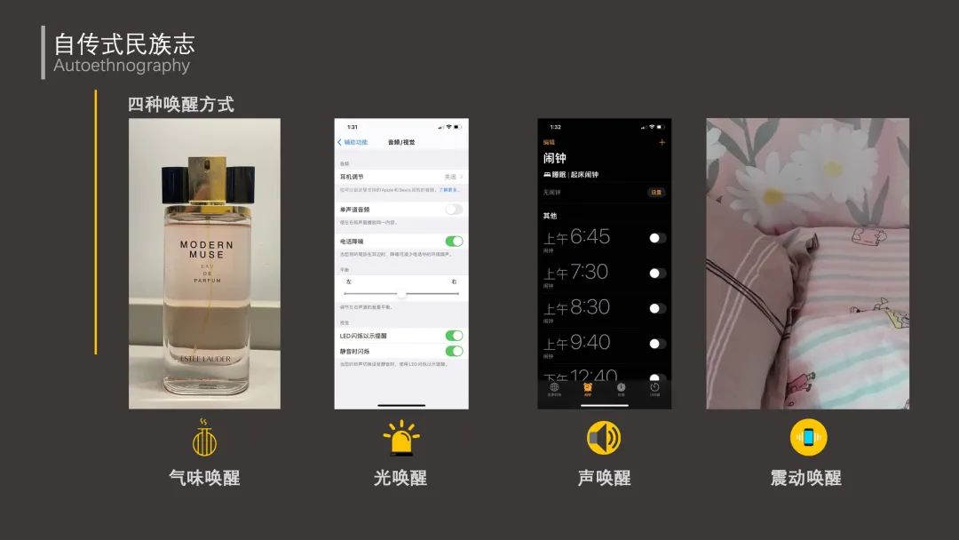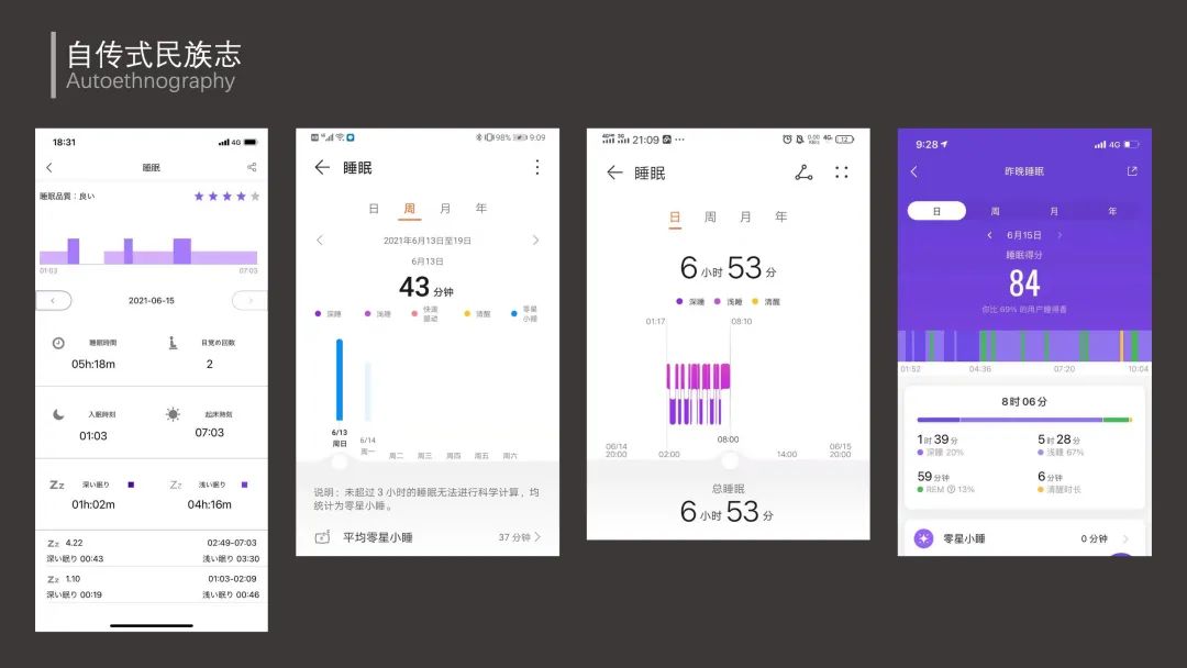 通过研习“设计研究 + 自传式民族志”的研究论文,理解具体研究方法及应用方式。根据小组选题设计并执行为期三天的自传式民族志,分析数据形成研究汇报与设计洞察。