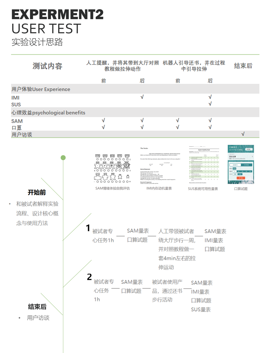 为了验证设计干预方式的有效性,我们进行了人工引导与还书机器人引导运动的对照实验(n=9),并借助多种量表评估用户的使用体验。