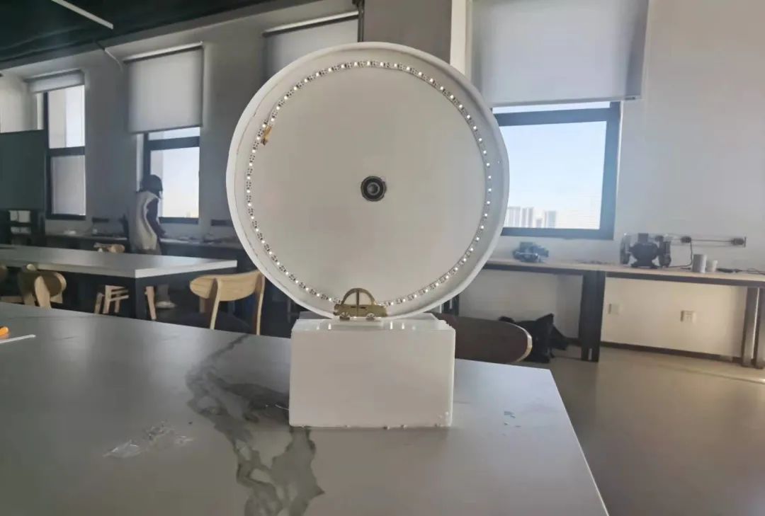 装置整体暗含钟表与车轮的意象,是时间与空间变化的表现。温暖的灯光会告诉孩子家长的位置,孩子与家长也会看到同样的风景,天涯共此时。我们的设计实践围绕着这样一句话展开:“交互设计能够让用户在工作、娱乐、交流之际获得难忘,有效,简单,有益的体验”。
