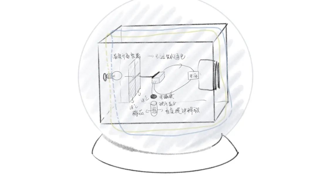 我们利用磁泥形变的戏剧化效果以及感温变色涂料的特性来体现温度的变化。随温度升高“火山”壳体在内部活动机构的带动上下运动,模拟火山喷发时岩石掉落的过程;与此同时,温度的升高会促使涂覆表面的变色涂料一步步显示出赤红的颜色,体现“火山”喷发的炽烈效果。对于空气质量或者卫生情况因素的反馈,我们采用的电控调光玻璃;半透明调光膜环绕“火山”口,随空气质量的恶化,透明度会逐渐降低;借此模拟一种火山口表面云雾重重的效果,同时反馈相关环境指标的变化。
