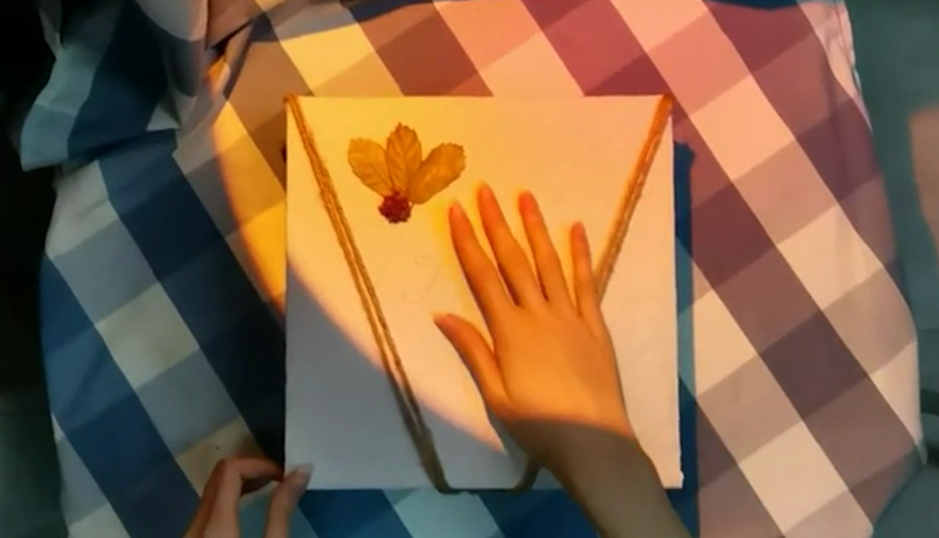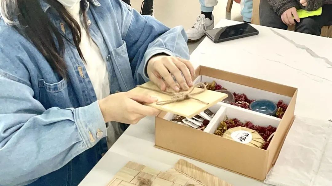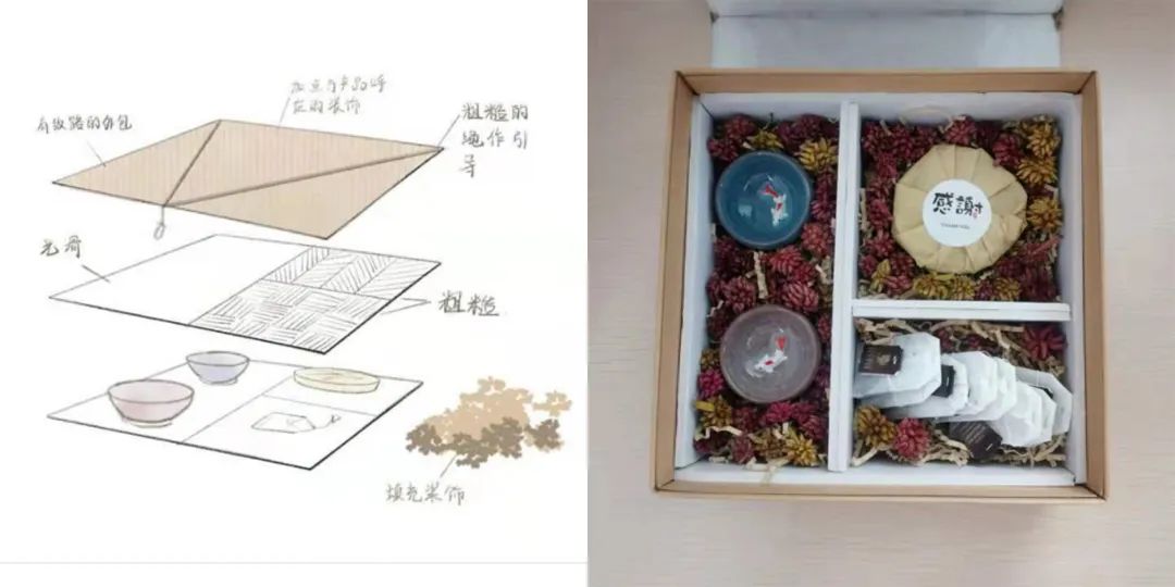 白色皱纹纸的纹理暗示着茶叶的脉络,并且皱纹纸的柔软温暖和里面瓷器的坚硬冰冷形成反差。麻绳由盒的上面连接至开口,形成了触觉上的引导。小盖上的材质不同暗示分区的内容物不同,用小木棍摆出类似叶脉的纹理暗示里面装的是茶叶,茶叶用牛皮纸包成了传统的茶饼模样。装瓷器的格子填满了干花和纸条,干燥和刺手蓬松的感觉和瓷器的冰凉光滑形成对比,让用户可以很快拿取。