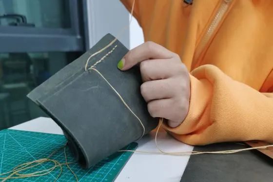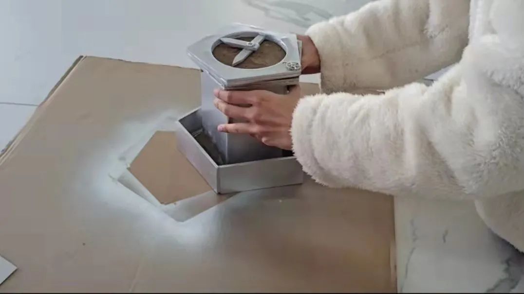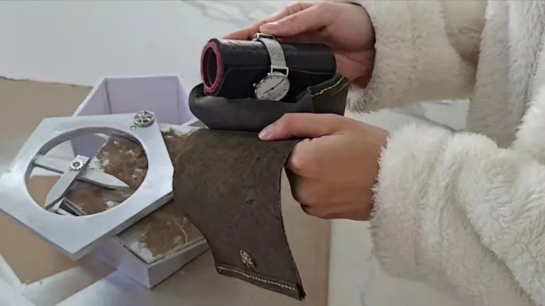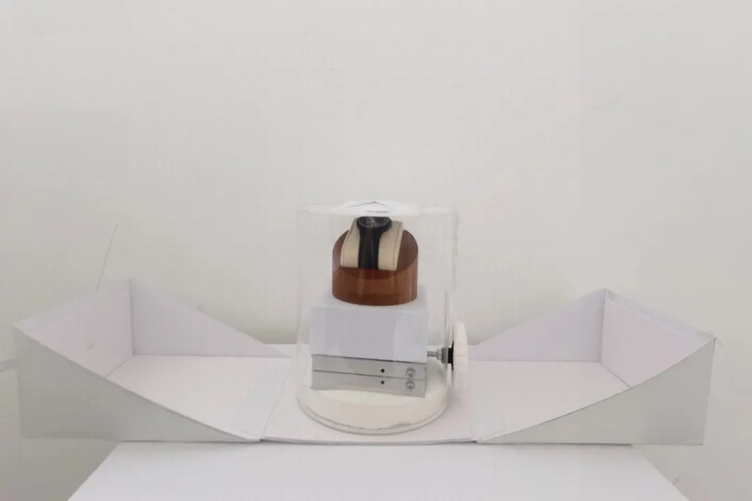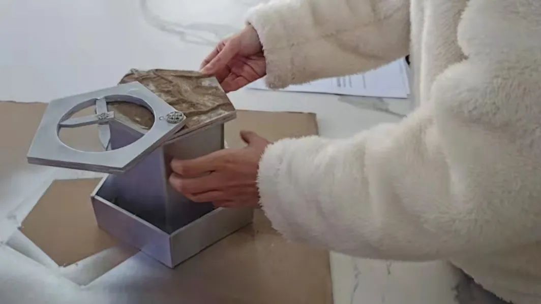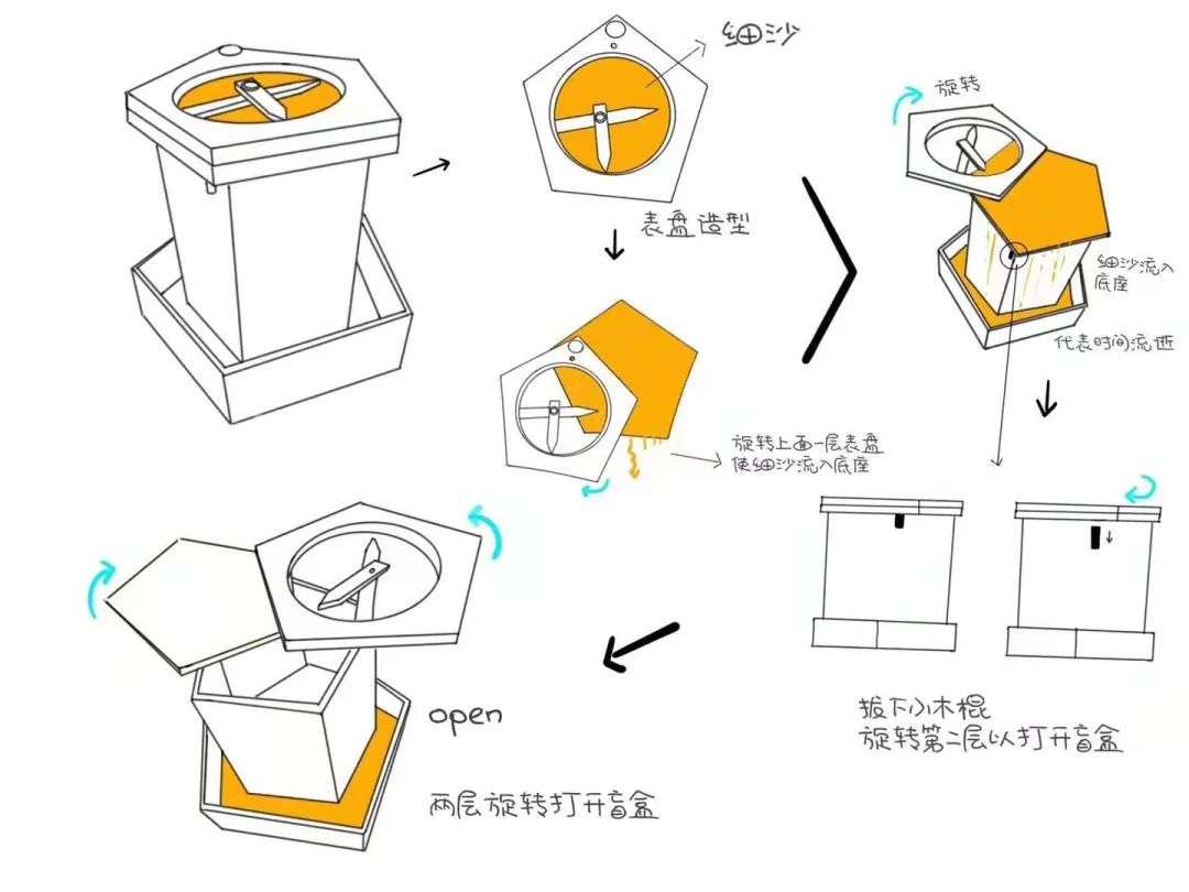 我们盲盒中的产品是一款银色的手表,它的外观是银色五边形直筒状,运用旋转的方式打开,旋转的过程中我们设置了小机关,需要把两个小木棍取下才能旋转开。两层盖子可以向不同方向旋转。旋盖的过程中,体现时间这一元素的沙子会从空心的钟表形状盒盖中倾泻进盒底的凹槽中。打开盒子,里面是我们纯手工缝制的墨绿色皮革包。沙子的流逝代表时间的流逝,复古的皮革代表手表的精致,珍贵和能够长久保存,让体验者有更强的代入感。