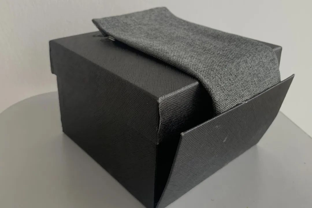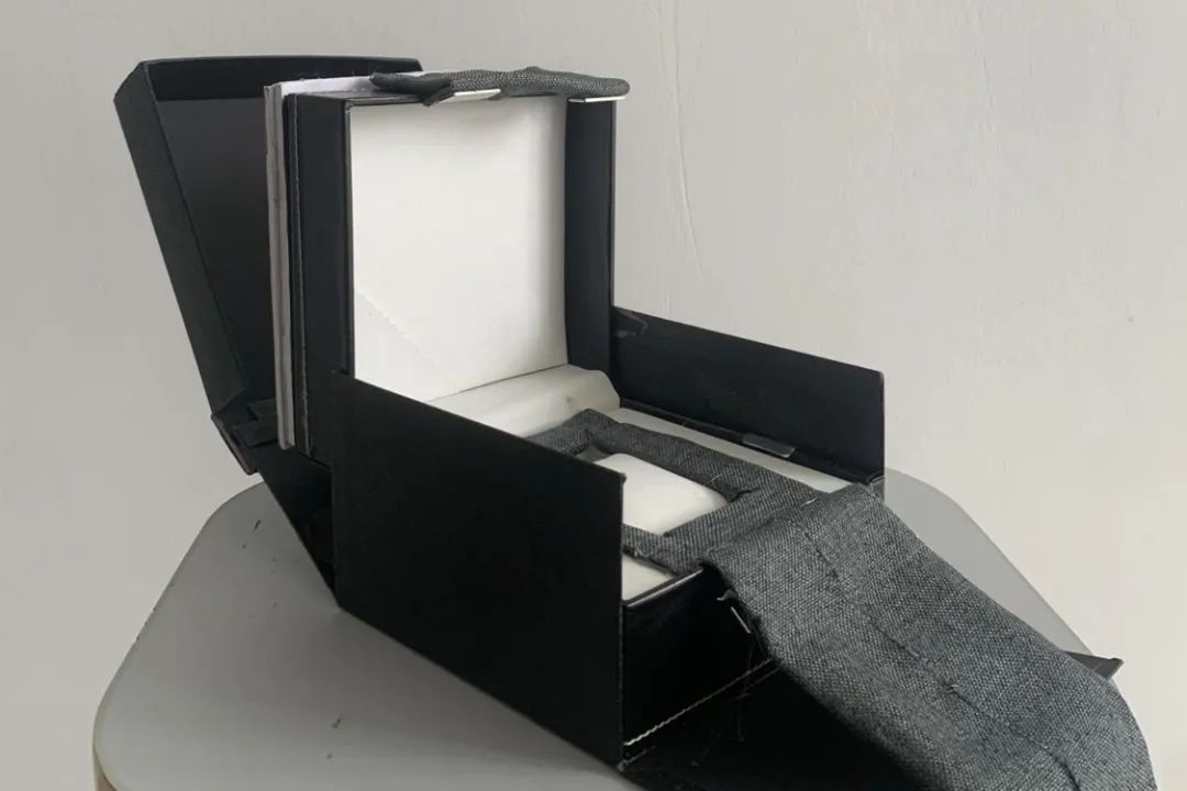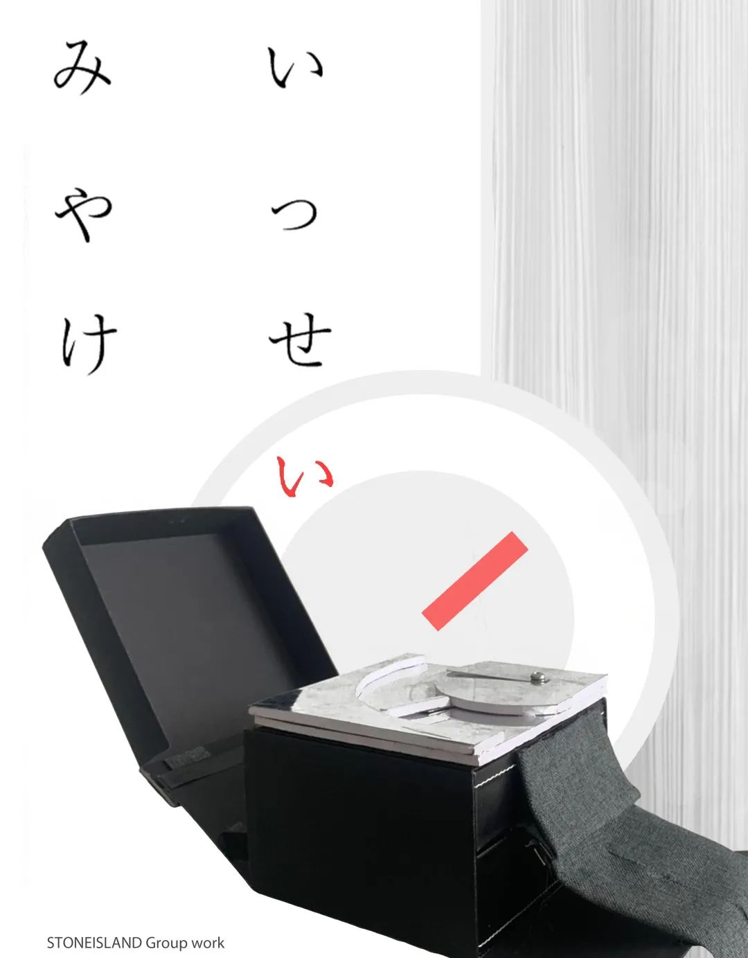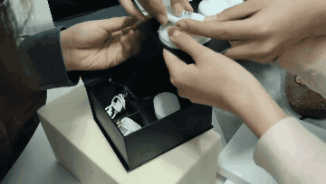 三宅一生因其具有着特殊质感的布料受人喜欢,所以在包装的最外层,我们运用了视觉暗示的理念,采用织物条带贯穿包装盒体,一方面,条带的造型利用触觉感官为用户带来表带的抽象感受,起到暗示产品的作用;另一方面,条带作为开盒机构的一部分,其贯穿延伸的设计可以引导用户的触摸路径,最终触发精巧的开盒机构,体验感十分丰富;为了给用户营造愉悦的开盒体验,我们将馥郁的香氛纳入包装的各个部分,使用户在接触产品之前就体会到我们的关怀。