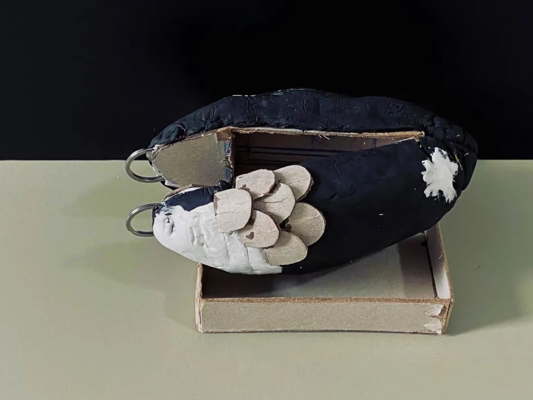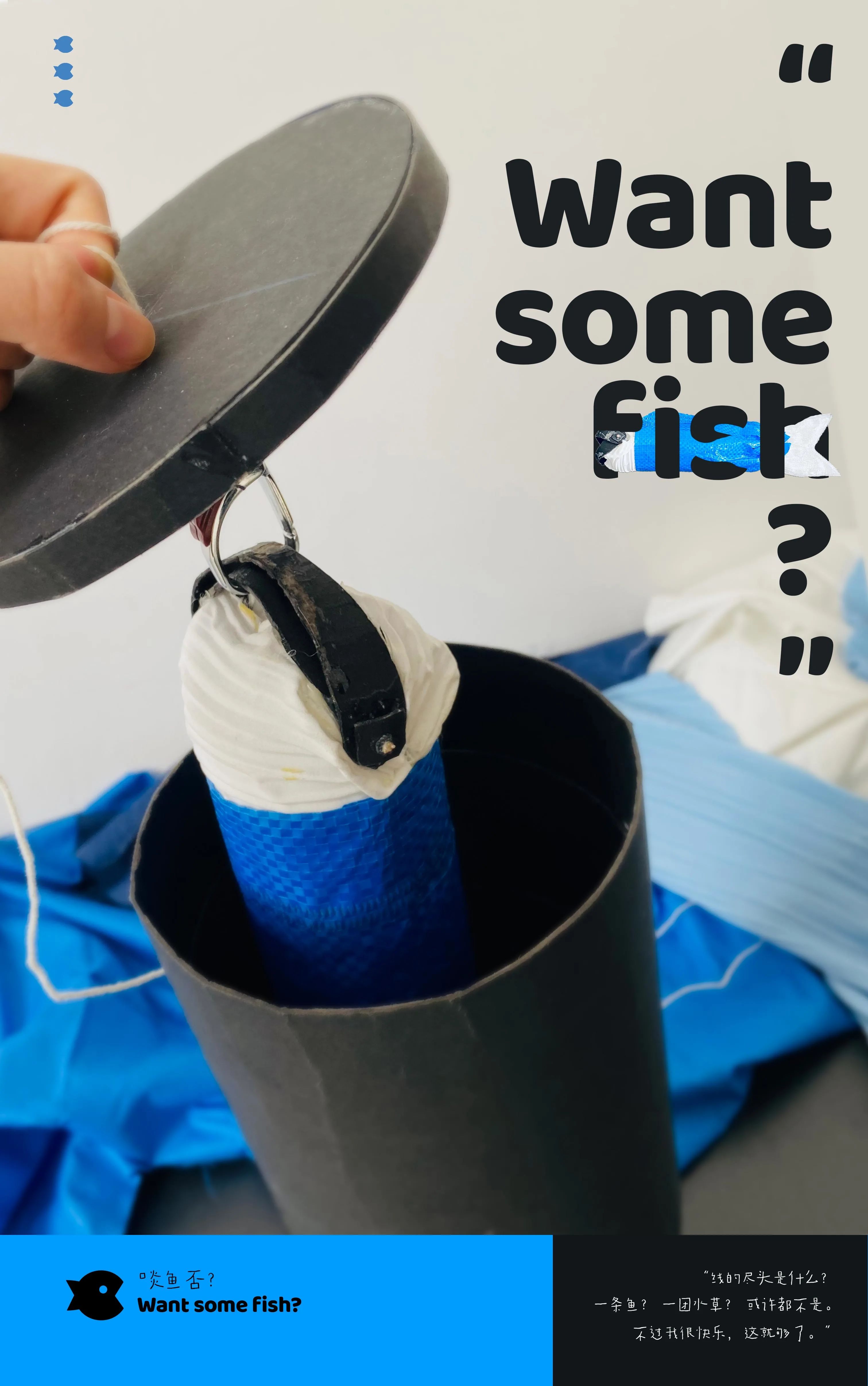 通过拉拽细绳,鱼型的内盒会将外层的盖子顶开,仿佛大鱼咬钩;鱼型的内盒表面包裹了有纹理的塑料布,体验者可以通过摸索感知到类似鱼鳞的触感;金属挂钩拴住了内盒开口,打开内盒的过程就像从鱼嘴上取下鱼钩;最后,张开“鱼嘴”就可以获得“鱼”肚子里的零食了。