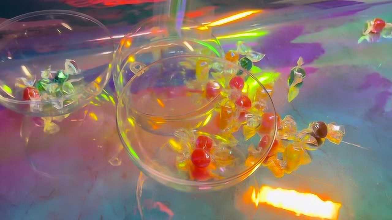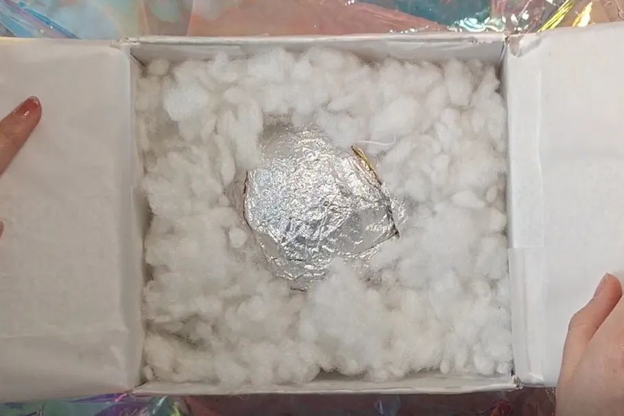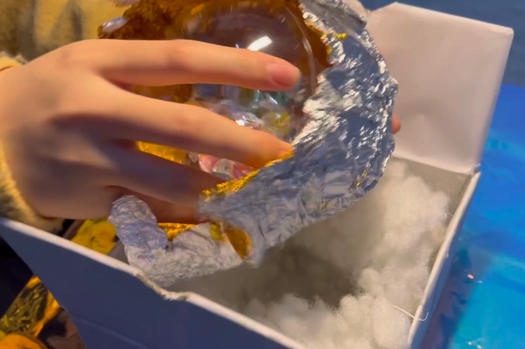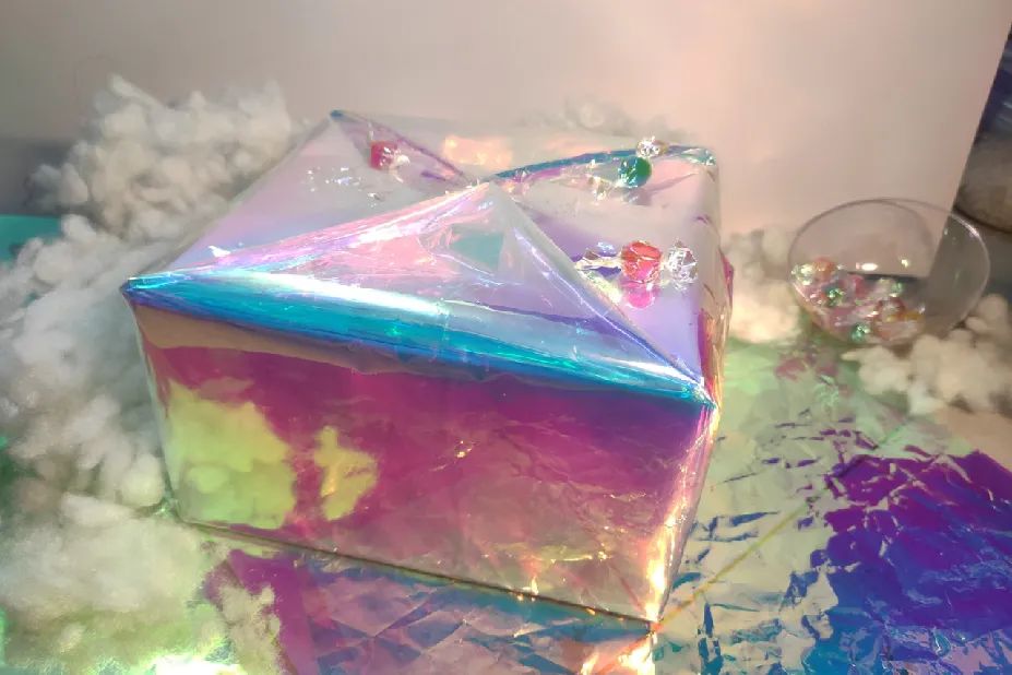 我们组的盲盒设计选择为糖果,盲盒的最外层通过彩色镭射纸模仿瑞士方块糖纸折法包裹内部白色硬壳进行包装,壳内选取具有糖果香气的暖白棉花团用作氛围填充,内部装置则模仿费列罗巧克力球的包裹样式,放置由金箔纸包裹的装有丰富彩色糖果的透明海洋球。