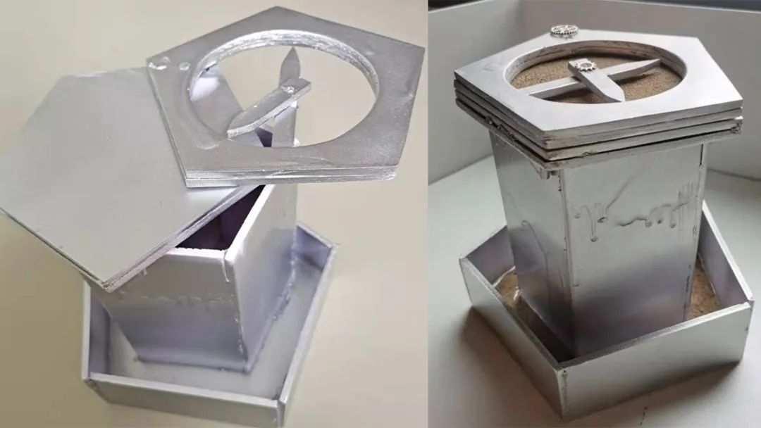 起初构想的是盒子的上下都做成齿轮的形状,因为形状过于复杂我们组决定换成五边形的形状,一开始想在下面的凹槽的几个角放小沙漏,后来觉得把沙子放在空心的盒盖中,开盖的过程中倾泻在下面凹槽中的方式更好。