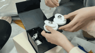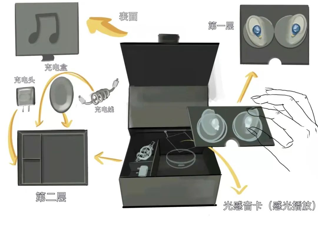 首先包装表面的音符形状凸起给予体验者第一步的信息传递,打开盒盖后盒内会播放音乐,且声音逐渐由小变大,同时体验者能够触摸到放在耳机形状模型之上的助听器产品,直观的理解产品的使用方法和功能,再次打开隔层后便可以拿到充电线、储存盒等附属产品。
