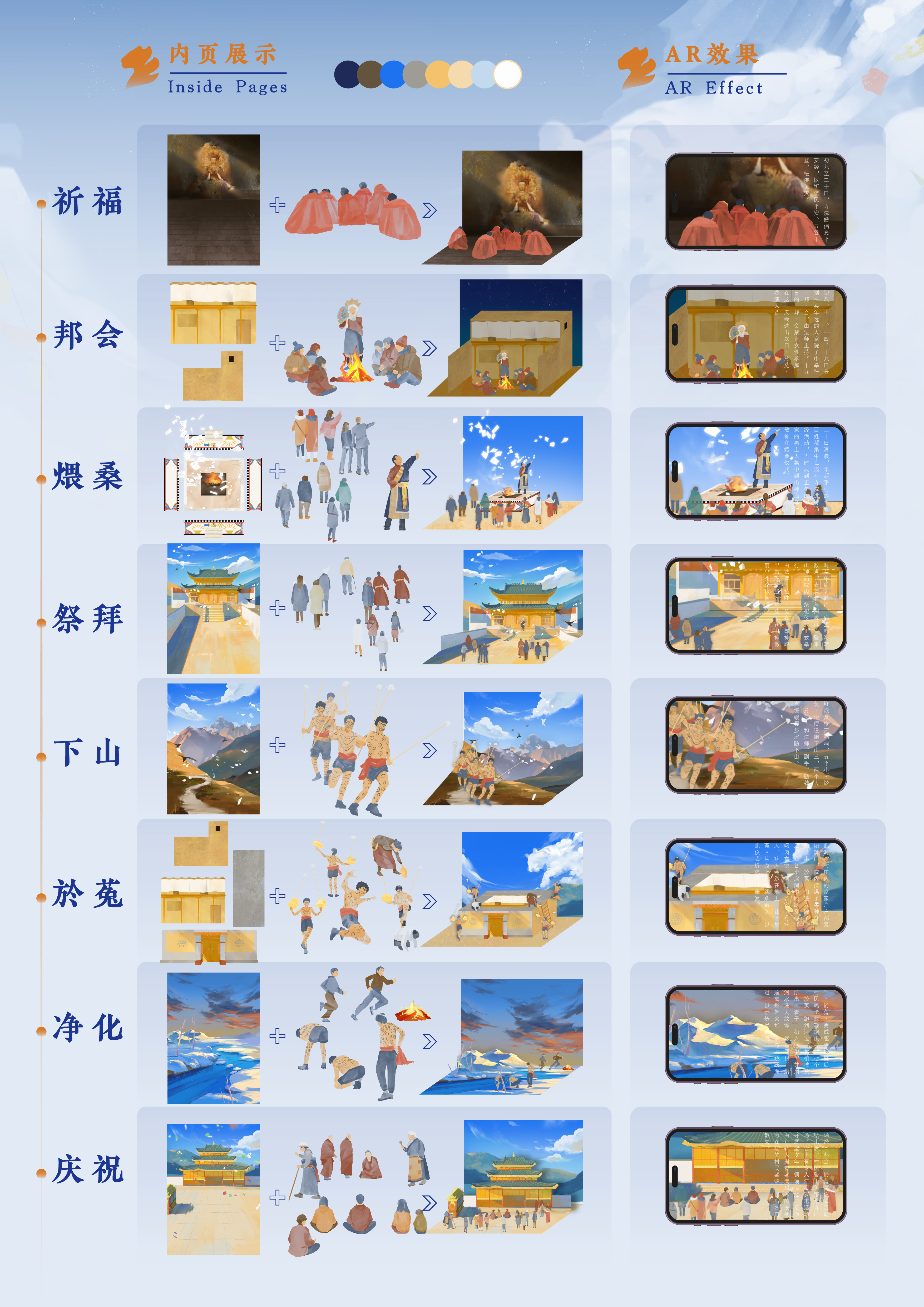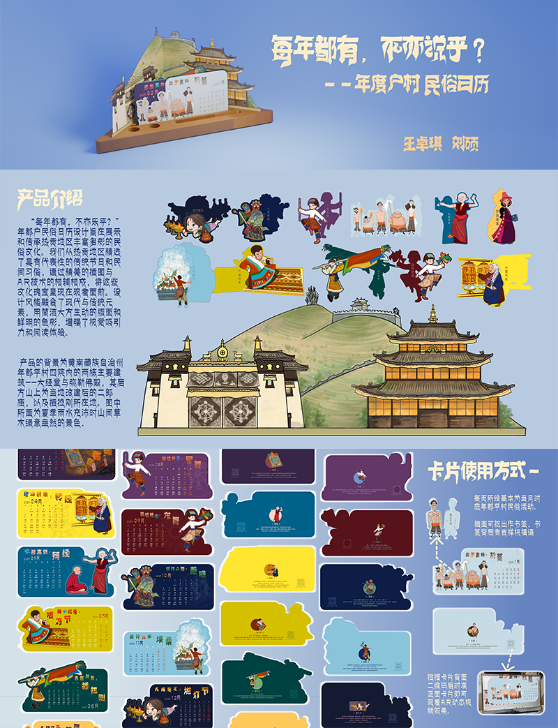 年都户民俗日历设计旨在展示和传承热贡地区丰富多彩的民俗文化。我们从热贡地区精选了具有代表性的传统节日和民间习俗,通过精美的插图与AR技术的相辅相成,将这些文化瑰宝呈现在观者面前。设计风格融合了现代与传统元素,用简洁大方生动的版面和鲜明的色彩,增强了视觉吸引力和阅读体验。每个月的页面都包含了相关节日的历史背景、民俗活动及其文化意义,如於菟、晒佛、羌姆等等,使读者在日常生活中真切的感受到年都户村及热贡地区的特色民俗。同时,日历中特别设置了互动环节,鼓励观者参与和体验这些习俗,让观者足不出户就能感受热贡习俗的独特魅力。
