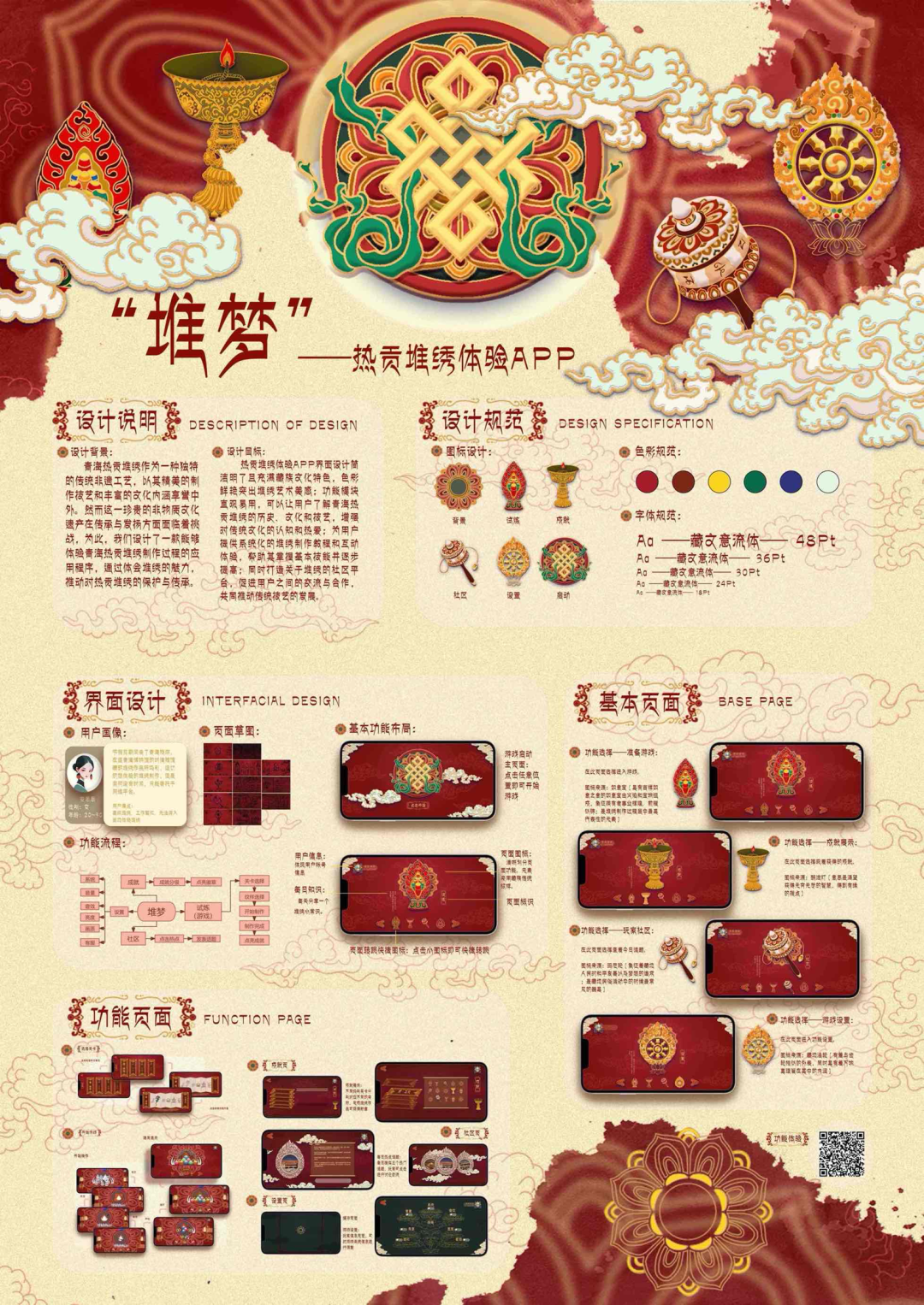 热贡艺术产生于13世纪的青海黄南藏族地区,2006列入国家第一批非物质文化遗产。其中热贡堆绣以藏族历史人物和神话、传说、史诗等为主要创作内容,同时也包括一些世俗化的内容。热贡堆绣凭借其独特的审美观念和独有的传承习惯在藏族文化中具有重要的历史价值和艺术价值。本作品从交互的角度出发,以游戏创作为形式,通过对藏文化和热贡堆绣制作过程的梳理,打破了传统热贡堆绣传播发展的方式,实现了传统艺术向现代设计的转化,解决了热贡堆绣只能在特定文化背景下传播的困境。