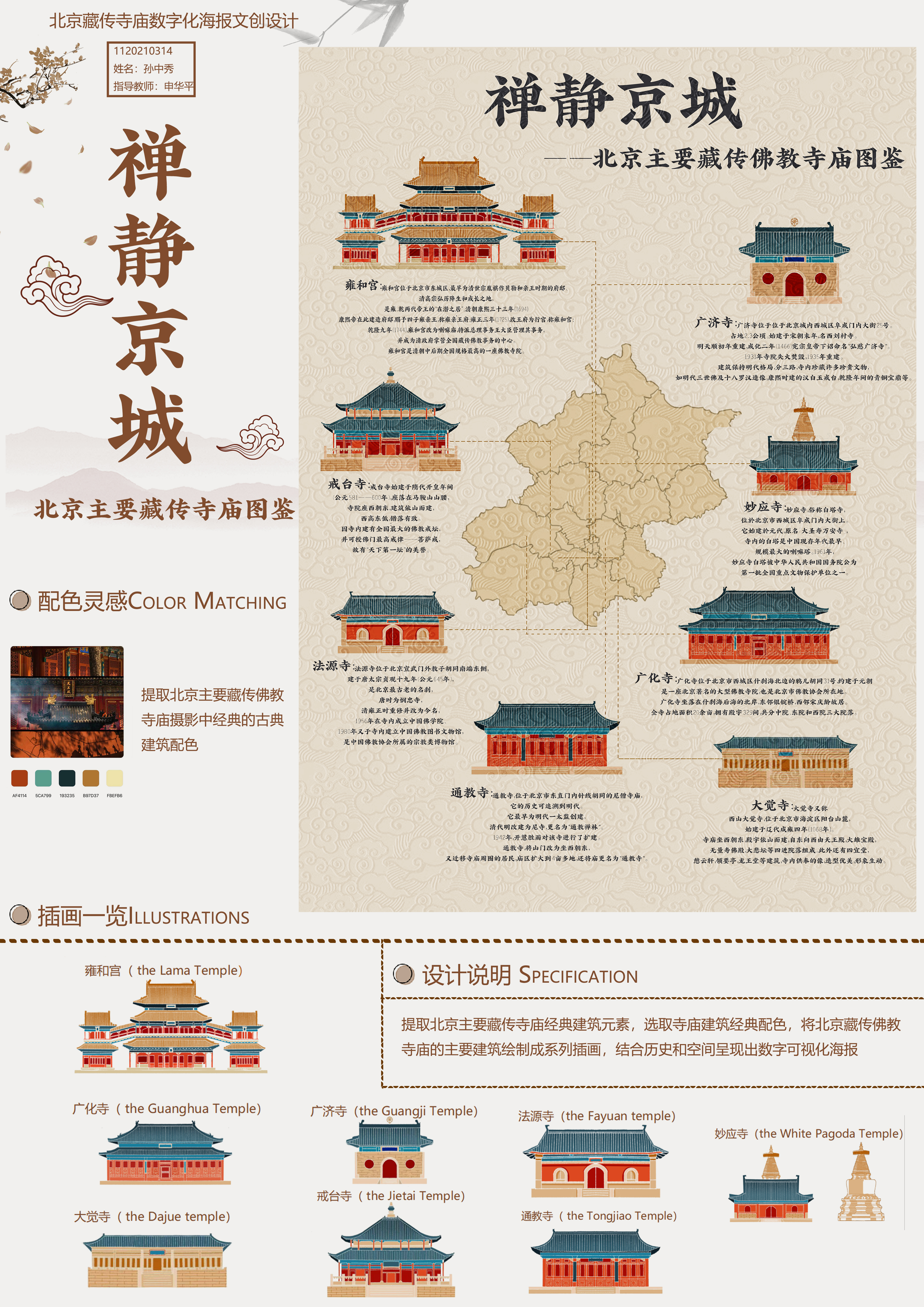 佛教文化是中国传统文化的一部分,寺院建筑作为中国古代建筑的一种形式,长久以来学术界颇为关注。本设计提取北京主要藏传寺庙经典建筑元素、寺院建筑布局和建筑型制以及古典寺庙配色,结合其相关历史文献、地理分布位置,对北京藏传佛教寺庙进行梳理,呈现视觉可视化效果的海报,为北京地区传统文化研究提供一个具有现实意义的参考。
