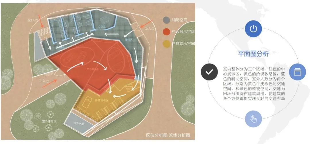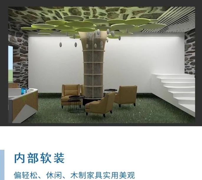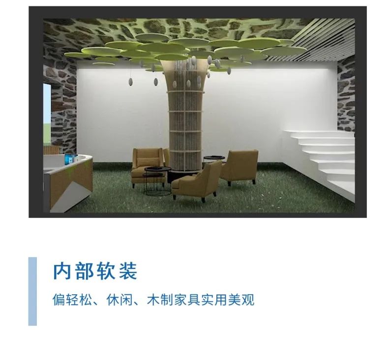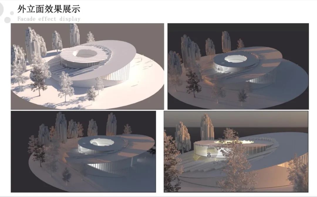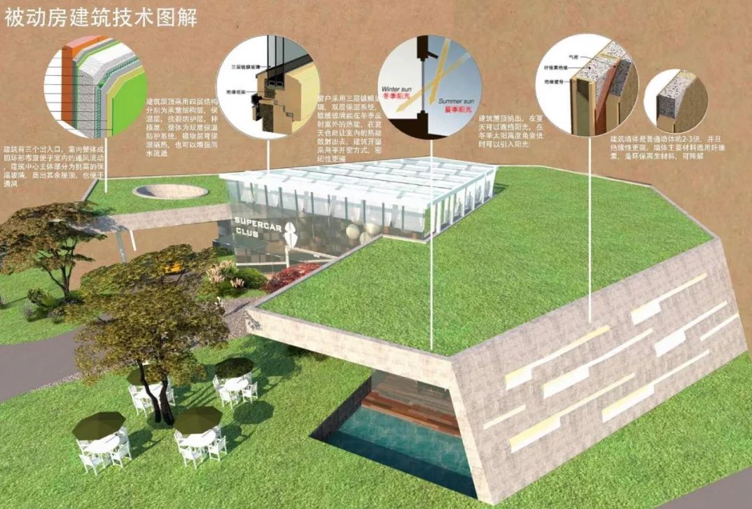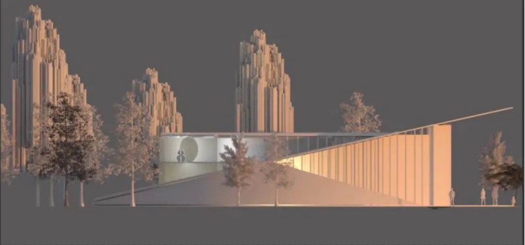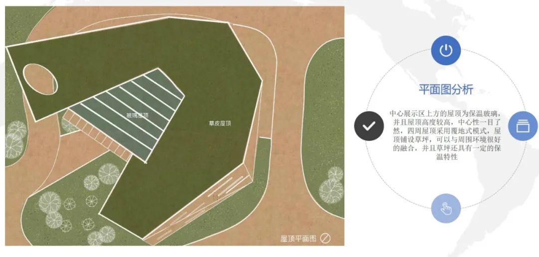 我们的另一重要设计因素是自然环境,展厅高度与场地结合,最大程度上建立了建筑与环境,室内与室外的联系,具体在设计方面采用了覆地式模式,在屋顶上铺设草坪,与环境融为一体,建筑大面积开窗,使室内外视野更加开阔,建筑水平横向布局,使建筑隐匿与环境中。
