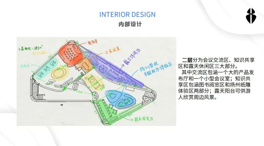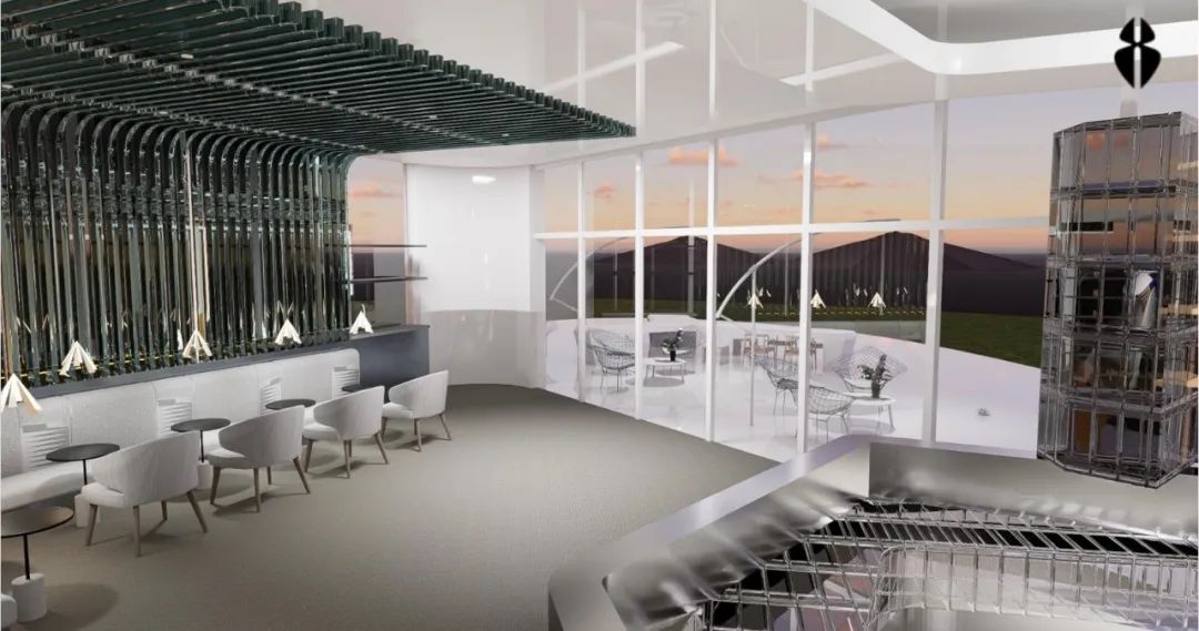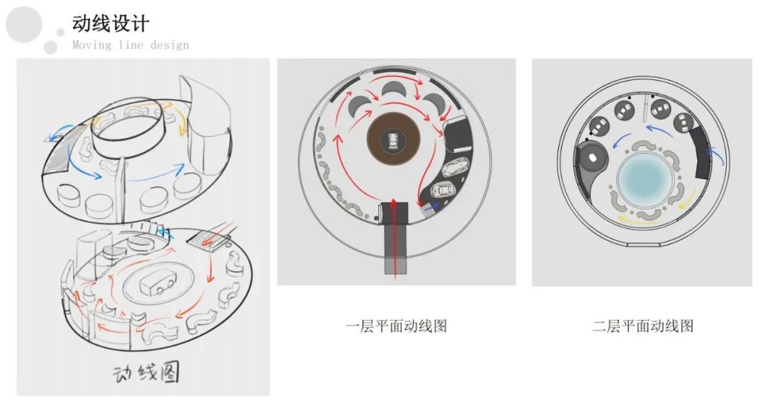 设计说明:展厅的设计核心为NEW圈,其概念是希望给人们一个新的圈子,不再是工作生活娱乐相互分开的状态,而是用汽车这一元素,将工作生活娱乐串联在一起,打破原来的小圈子,共同融合成一个大圈子。我们的汽车展厅就设计成集合消费,休闲,娱乐为一体的都市生活圈,让更多的人参与进来。NEW和NO的发音相同,NO也是拒绝和打破固有生活的概念,因此我们的设计从n和o两个字母出发。
