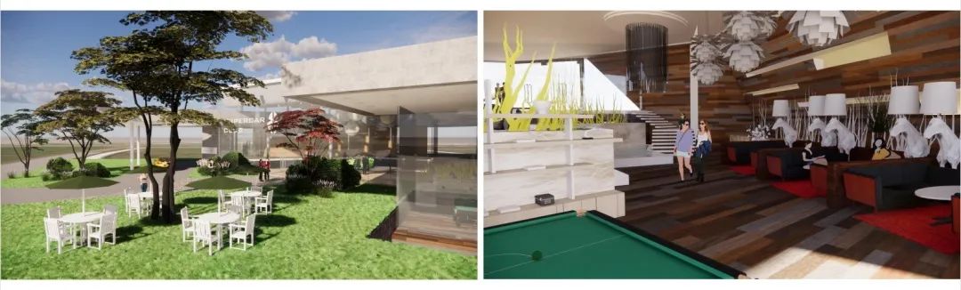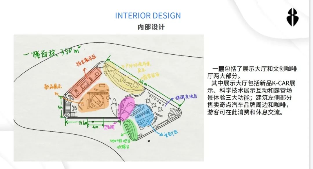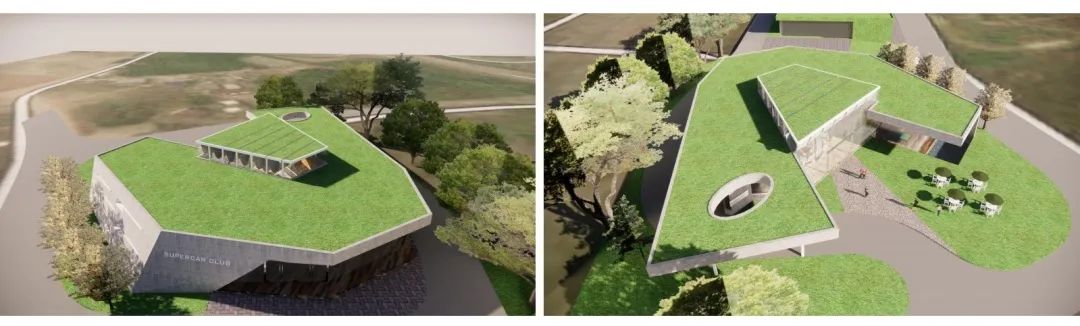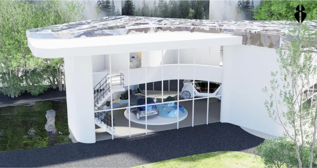 设计说明:奇点汽车“漫野奇间”K-CAR城市体验中心是集展示、体验、科普、交流和休闲于一体的综合性展览馆,在草坪与树木植被围绕的环境中以偏向自然流动感的形态出现,融入周边环境,将奇点汽车使用新能源的绿色理念在游客参观过程中传达,也展现K-CAR车型轻盈特质。