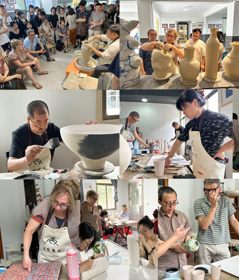 6月29日至7月2日,在景德镇陶艺实践基地教学期间,Hoffmann教授与Manuel Franke教授为同学们做了题为《德国当代艺术的公共性》和《艺术创作理论与实践》的两场讲座。他们通过对自身艺术作品的解读,向学生们阐释了艺术实践的时间性、公共性以及作品背后的创作思考和深意。他们还与景德镇国家拉坯技能大师及王乐耕等教师一起合作,给学生们进行了艺术创作示范,并与杨建明院长、周岩、王乐耕联合创作了系列瓷板画作品。这场别开生面的艺术创作体验为同学们带来了全新的启发,为本次“传统工艺美术研究与基地实践”课程增添了新的学术营养,也为培养模式的探索提供了新的参考依据。