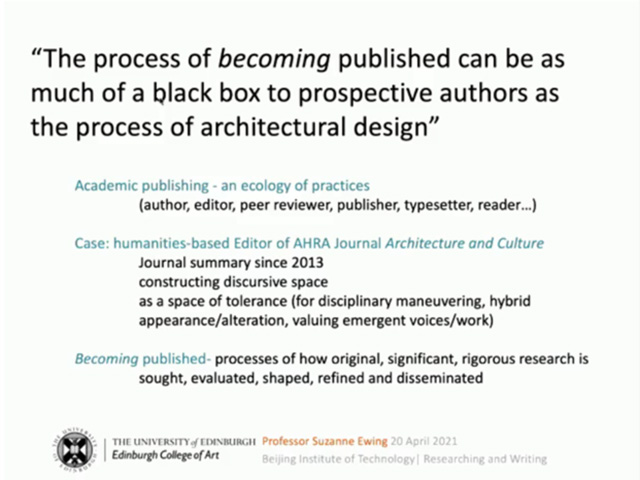 整体讲座分三个部分。第一部分是由如复杂生态的学术出版。她识别出三个部分去揭开这个生态迷雾,分别为Content(如建筑、展览、研究课题…)、Sites (如图书、文章、学术期刊…)、Sifting (如目标+范围、主题、征稿…)。并将重点放在Sifting上,强调理解出版——即将成果展现在公正面前的整个过程尤为重要。第二部分是以她作为联合主编的《Architecture and Culture》期刊为具体案例,进一步解释上述出版过程的发生(Becoming)。她指出《Architecture and Culture》的主题是多样的、包容的,涵盖了历史、文化、艺术、智慧城市、女性主义等多方面的关于人文的建筑及城市议题。第三部分是作为编辑实践的4条基本原则:构建话语空间、学科机动性(disciplinary maneuvering)、多层级,可传达展现、重视编辑协同与自然发生的话语。总体上来说,这三部分逐环环相扣,从涵盖建筑、文章、展览等的“大出版”环节概述,深入到针对期刊所具有的权力、应当承担的学科、人文、责任以及相应原则制定,继而具体到期刊文章的构思、写作、协同编辑、最终出版环节。深入浅出的剥离出版“黑箱”的层层外衣。