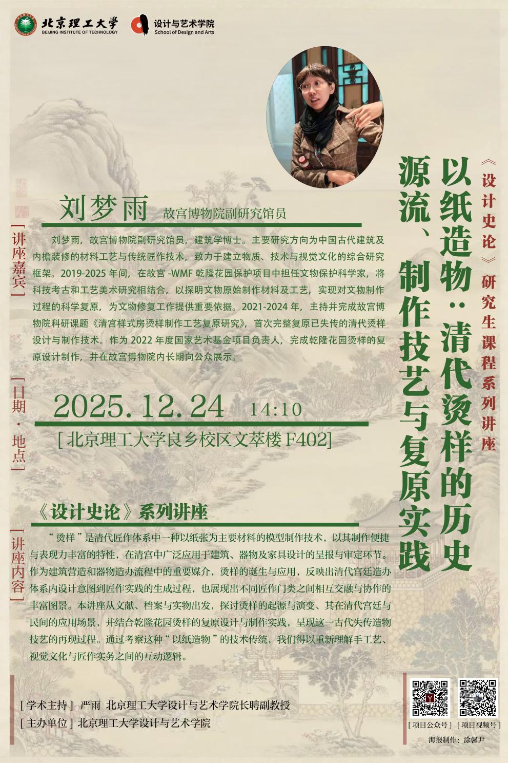 “烫样”是清代匠作体系中一种以纸张为主要材料的模型制作技术,以其制作便捷与表现力丰富的特性,在清宫中广泛应用于建筑、器物及家具设计的呈报与审定环节。作为建筑营造和器物造办流程中的重要媒介,烫样的诞生与应用,反映出清代宫廷造办体系内设计意图到匠作实践的生成过程,也展现出不同匠作门类之间相互交融与协作的丰富图景。本讲座从文献、档案与实物出发,探讨烫样的起源与演变、其在清代宫廷与民间的应用场景,并结合乾隆花园烫样的复原设计与制作实践,呈现这一古代失传造物技艺的再现过程。通过考察这种“以纸造物”的技术传统,我们得以重新理解手工艺、视觉文化与匠作实务之间的互动逻辑。